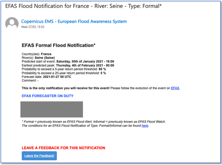 The EFAS notifications do not aim at summarizing all the detail of an EFAS forecast. Instead, they aim to raise the awareness about the risk of an upcoming flood in a specific river section and invite the EFAS partner to look at all the forecast details in the EFAS map viewer.