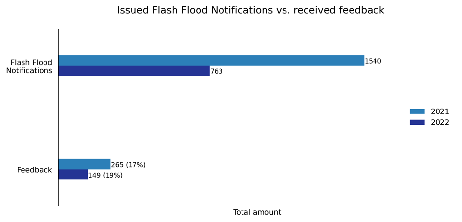 The analysis of the feedback received for Flash Flood Notifications shows that there have been more than 2 times as many Flash Flood Notifications been issued in 2021 (1540) compared to 2022 (763). The response rate was similar in both years with 17% in 2021 and 19% in 2022 (Figure 15). This graph applies the former method of counting; therefore, multiple feedbacks may still be included in the counts. This will be corrected in the next years feedback analysis.